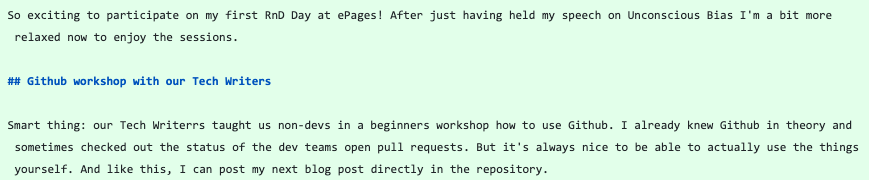 From the GitHub for beginners workshop that I held together with my colleague, we gathered some statements about the R&D Day. After a 90 minutes workshop, our newborn GitHubbies (all non-devs!) were able to make a Pull Request to our epages-devportal. We asked them to commit some thoughts about the day, and here we go with some quotes: