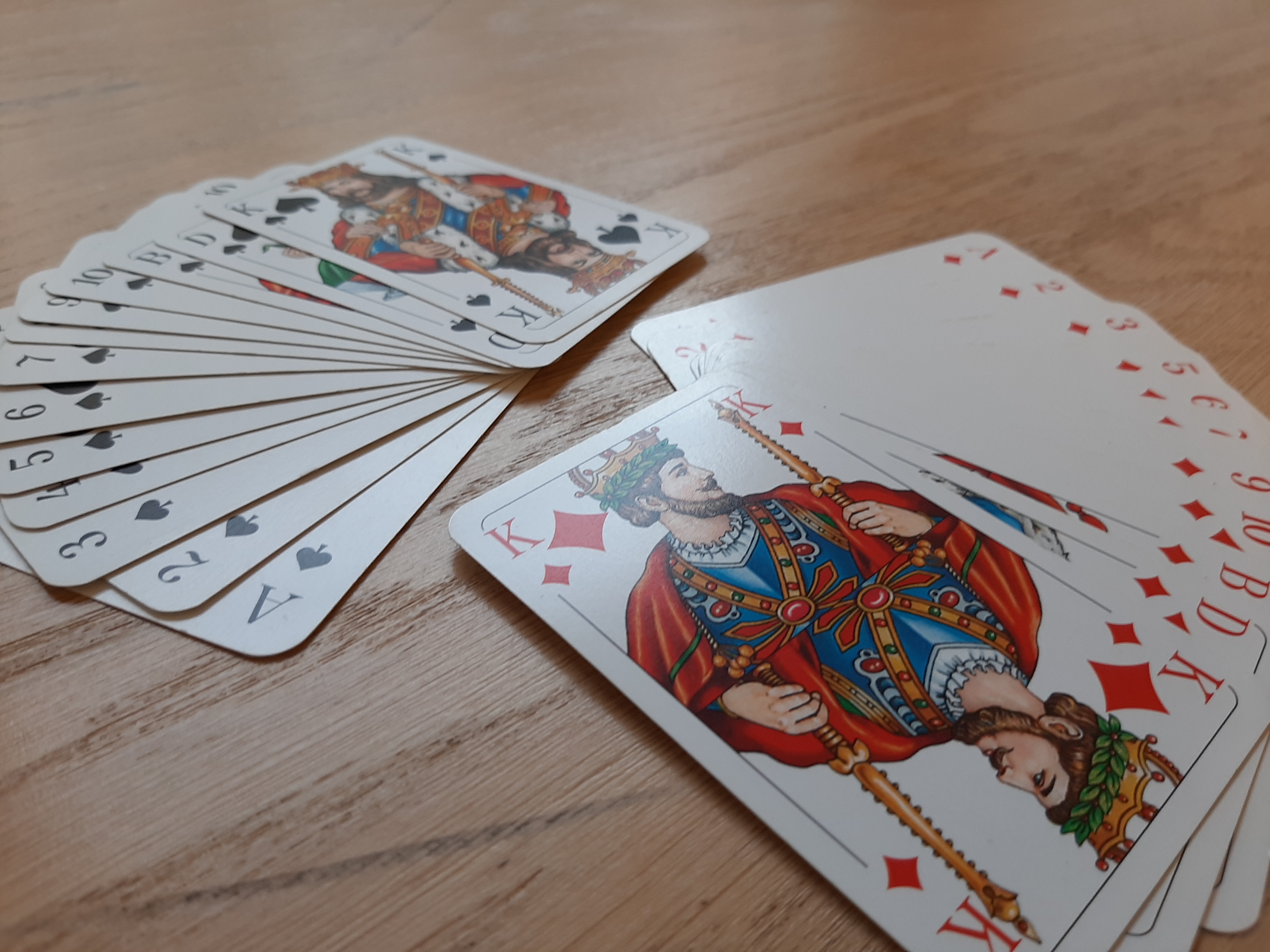 Only sitting in one of our conference rooms for an hour and listening to what Scrum is about would be way too boring. So, what our Scrum Master prepared was a little game in the beginning. We as a team had the following task: We got a double deck of cards (each deck of cards contains 52 cards) which we had to sort by card colour (red and black) and card type (hearts, diamonds, spades, and clubs). On top of that we were asked to order the card value from low (ace) to high (king). Our colleague in Jena got half a deck of cards to keep it fair. Before we started to sort the cards, we had to discuss in the team how much time we think we will need for the task. Then, we had two minutes to discuss how to solve the task: